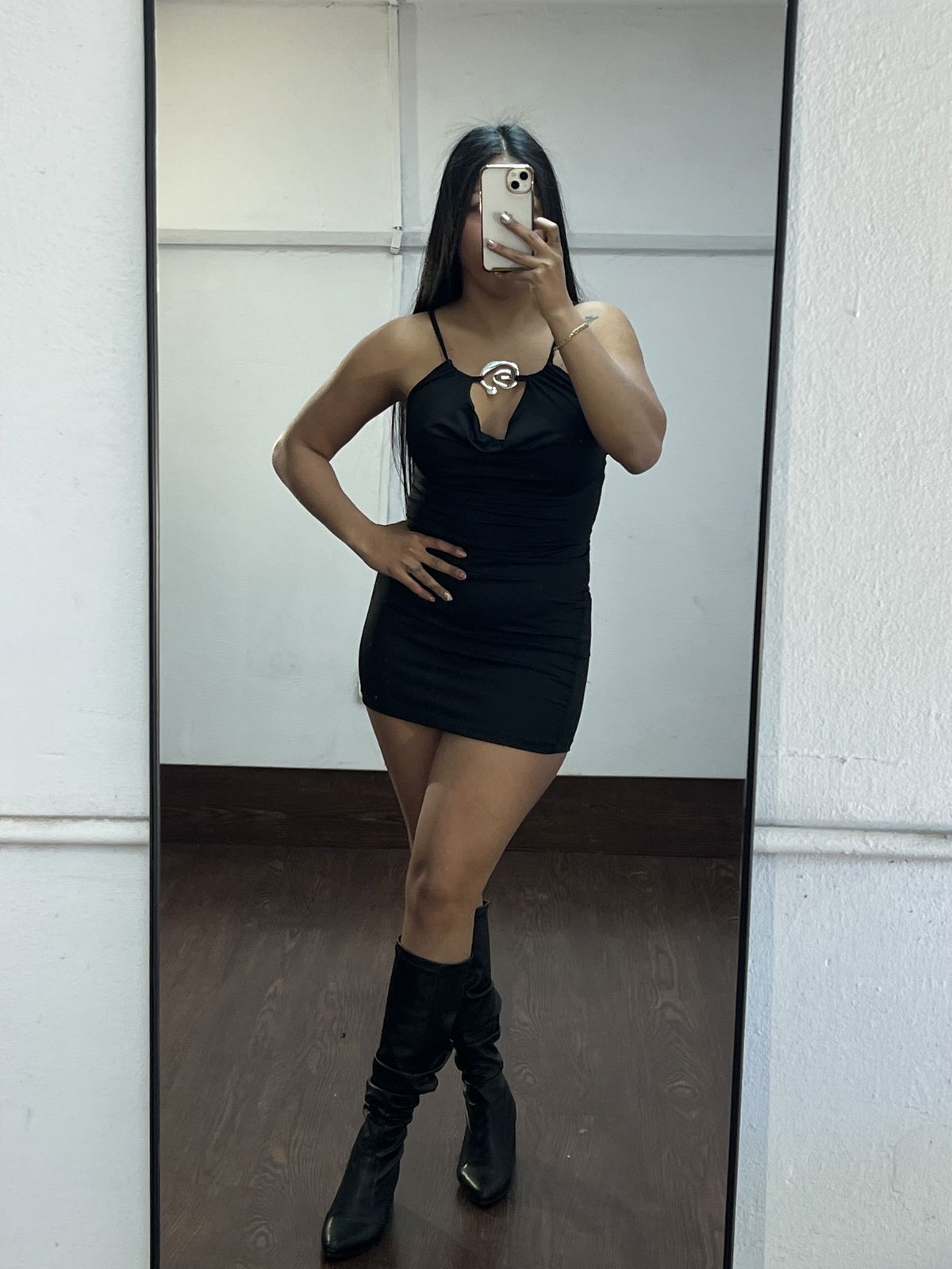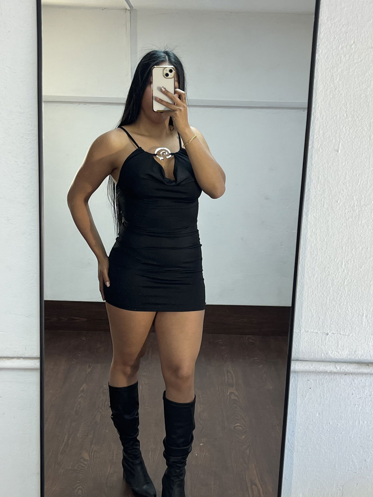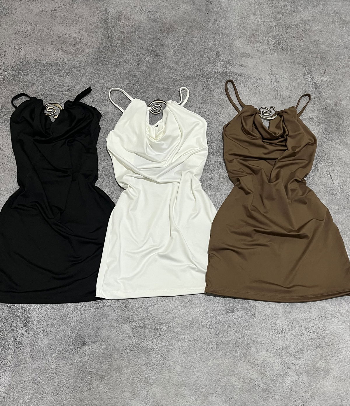 Vestido corto con avio plateado y espalda cruzada regulable . Sede hasta un L/XL